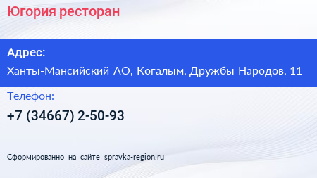 Югория, ресторан по адресу Ханты-Мансийский АО, Когалым, Дружбы Народов, 11 в дальнейшем Организация, размещена в следующих категориях: