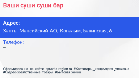 Ваши суши, суши-бар по адресу Ханты-Мансийский АО, Когалым, Бакинская, 6 в дальнейшем Организация, размещена в следующих категориях: