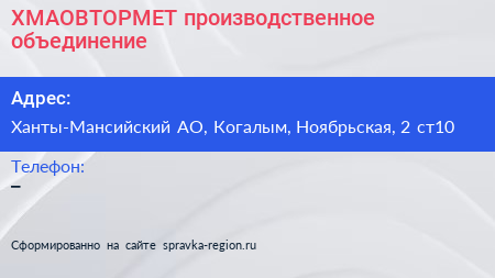 ХМАОВТОРМЕТ, производственное объединение по адресу Ханты-Мансийский АО, Когалым, Ноябрьская, 2 ст10 в дальнейшем Организация, размещена в следующих категориях: