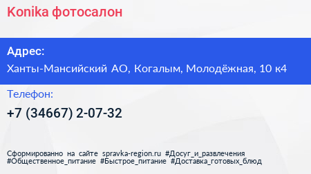 Konika, фотосалон по адресу Ханты-Мансийский АО, Когалым, Молодёжная, 10 к4 в дальнейшем Организация, размещена в следующих категориях: