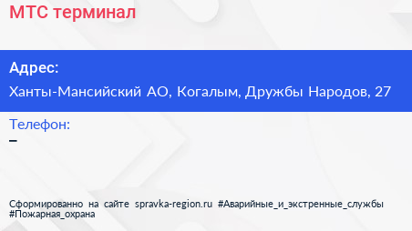 МТС, терминал по адресу Ханты-Мансийский АО, Когалым, Дружбы Народов, 27 в дальнейшем Организация, размещена в следующих категориях: