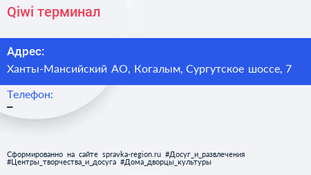 Qiwi, терминал по адресу Ханты-Мансийский АО, Когалым, Сургутское шоссе, 7 в дальнейшем Организация, размещена в следующих категориях: