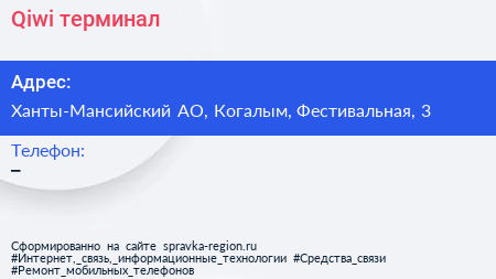 Qiwi, терминал по адресу Ханты-Мансийский АО, Когалым, Фестивальная, 3 в дальнейшем Организация, размещена в следующих категориях: