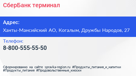 СберБанк, терминал по адресу Ханты-Мансийский АО, Когалым, Дружбы Народов, 27 в дальнейшем Организация, размещена в следующих категориях: