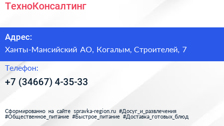 ТехноКонсалтинг по адресу Ханты-Мансийский АО, Когалым, Строителей, 7 в дальнейшем Организация, размещена в следующих категориях: