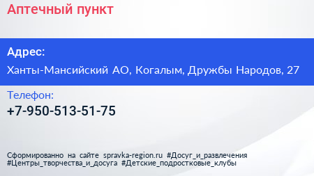 Аптечный пункт по адресу Ханты-Мансийский АО, Когалым, Дружбы Народов, 27 в дальнейшем Организация, размещена в следующих категориях:
