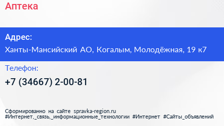 Аптека по адресу Ханты-Мансийский АО, Когалым, Молодёжная, 19 к7 в дальнейшем Организация, размещена в следующих категориях: