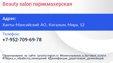 Beauty salon, парикмахерская по адресу Ханты-Мансийский АО, Когалым, Мира, 12 в дальнейшем Организация, размещена в следующих категориях: