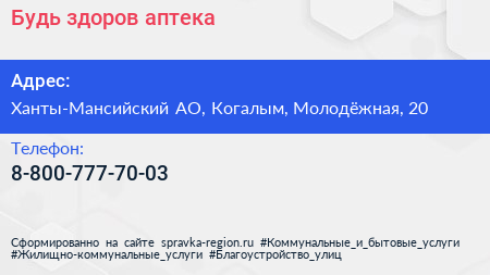 Будь здоров, аптека по адресу Ханты-Мансийский АО, Когалым, Молодёжная, 20 в дальнейшем Организация, размещена в следующих категориях: