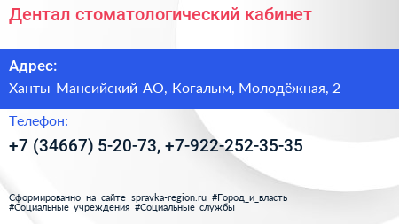Дентал, стоматологический кабинет по адресу Ханты-Мансийский АО, Когалым, Молодёжная, 2 в дальнейшем Организация, размещена в следующих категориях: