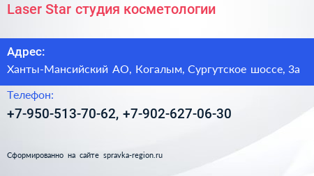 Laser Star, студия косметологии по адресу Ханты-Мансийский АО, Когалым, Сургутское шоссе, 3а в дальнейшем Организация, размещена в следующих категориях: