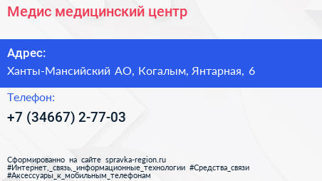 Медис, медицинский центр по адресу Ханты-Мансийский АО, Когалым, Янтарная, 6 в дальнейшем Организация, размещена в следующих категориях: