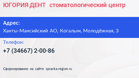 ЮГОРИЯ-ДЕНТ+, стоматологический центр по адресу Ханты-Мансийский АО, Когалым, Молодёжная, 3 в дальнейшем Организация, размещена в следующих категориях: