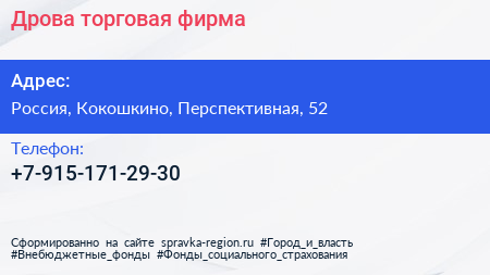 Дрова, торговая фирма по адресу Перекрёсток, 52, Перспективная улица, Коттеджный посёлок «Клубничные Поля», Большое Свинорье, район Внуково, Москва, Центральный федеральный округ, 143390, Россия в дальнейшем Организация, размещена в следующих категориях: