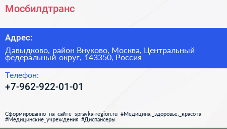 Мосбилдтранс по адресу Давыдково, район Внуково, Москва, Центральный федеральный округ, 143350, Россия в дальнейшем Организация, размещена в следующих категориях: