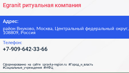 Egranit, ритуальная компания по адресу район Внуково, Москва, Центральный федеральный округ, 108809, Россия в дальнейшем Организация, размещена в следующих категориях: