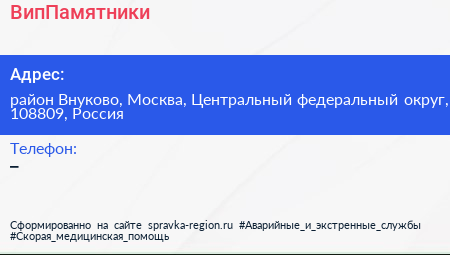 ВипПамятники по адресу район Внуково, Москва, Центральный федеральный округ, 108809, Россия в дальнейшем Организация, размещена в следующих категориях: