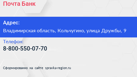 Почта Банк по адресу Владимирская область, Кольчугино, улица Дружбы, 9 в дальнейшем Организация, размещена в следующих категориях: