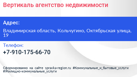 Вертикаль, агентство недвижимости по адресу Владимирская область, Кольчугино, Октябрьская улица, 19 в дальнейшем Организация, размещена в следующих категориях: