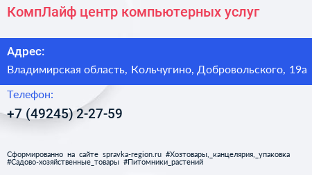 КомпЛайф, центр компьютерных услуг по адресу Владимирская область, Кольчугино, Добровольского, 19а в дальнейшем Организация, размещена в следующих категориях: