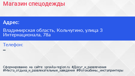 Магазин спецодежды по адресу Владимирская область, Кольчугино, улица 3 Интернационала, 78а в дальнейшем Организация, размещена в следующих категориях: