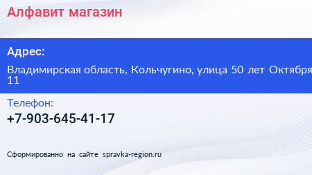Алфавит, магазин по адресу Владимирская область, Кольчугино, улица 50 лет Октября, 11 в дальнейшем Организация, размещена в следующих категориях: