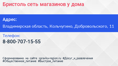Бристоль, сеть магазинов у дома по адресу Владимирская область, Кольчугино, Добровольского, 11 в дальнейшем Организация, размещена в следующих категориях: