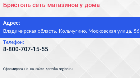 Бристоль, сеть магазинов у дома по адресу Владимирская область, Кольчугино, Московская улица, 56 в дальнейшем Организация, размещена в следующих категориях: