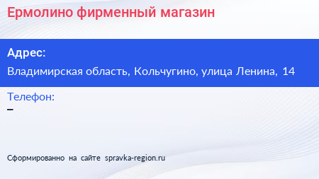 Ермолино, фирменный магазин по адресу Владимирская область, Кольчугино, улица Ленина, 14 в дальнейшем Организация, размещена в следующих категориях: