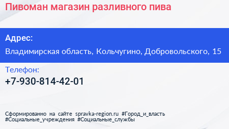 Пивоман, магазин разливного пива по адресу Владимирская область, Кольчугино, Добровольского, 15 в дальнейшем Организация, размещена в следующих категориях:
