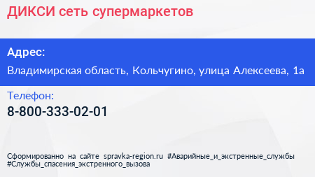ДИКСИ, сеть супермаркетов по адресу Владимирская область, Кольчугино, улица Алексеева, 1а в дальнейшем Организация, размещена в следующих категориях: