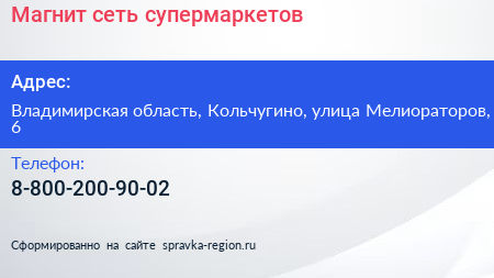 Магнит, сеть супермаркетов по адресу Владимирская область, Кольчугино, улица Мелиораторов, 6 в дальнейшем Организация, размещена в следующих категориях: