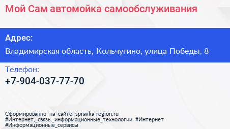 Мой-Сам, автомойка самообслуживания по адресу Владимирская область, Кольчугино, улица Победы, 8 в дальнейшем Организация, размещена в следующих категориях: