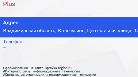 Plus по адресу Владимирская область, Кольчугино, Центральная улица, 1а в дальнейшем Организация, размещена в следующих категориях: