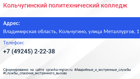 Кольчугинский политехнический колледж по адресу Владимирская область, Кольчугино, улица Металлургов, 1 в дальнейшем Организация, размещена в следующих категориях: