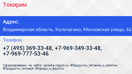 Токирим по адресу Владимирская область, Кольчугино, Московская улица, 62 в дальнейшем Организация, размещена в следующих категориях: