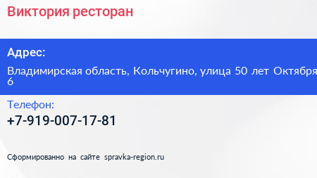 Виктория, ресторан по адресу Владимирская область, Кольчугино, улица 50 лет Октября, 6 в дальнейшем Организация, размещена в следующих категориях: