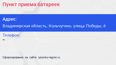 Пункт приема батареек по адресу Владимирская область, Кольчугино, улица Победы, 6 в дальнейшем Организация, размещена в следующих категориях: