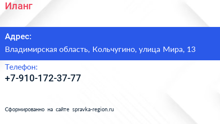 Иланг по адресу Владимирская область, Кольчугино, улица Мира, 13 в дальнейшем Организация, размещена в следующих категориях: