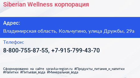 Siberian Wellness, корпорация по адресу Владимирская область, Кольчугино, улица Дружбы, 29а в дальнейшем Организация, размещена в следующих категориях: