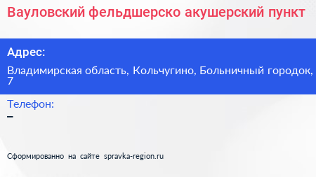 Вауловский фельдшерско-акушерский пункт по адресу Владимирская область, Кольчугино, Больничный городок, 7 в дальнейшем Организация, размещена в следующих категориях: