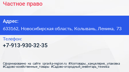 Частное право по адресу 633162, Новосибирская область, Колывань, Ленина, 73 в дальнейшем Организация, размещена в следующих категориях: