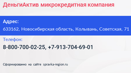 ДеньгиАктив, микрокредитная компания по адресу 633162, Новосибирская область, Колывань, Советская, 71 в дальнейшем Организация, размещена в следующих категориях: