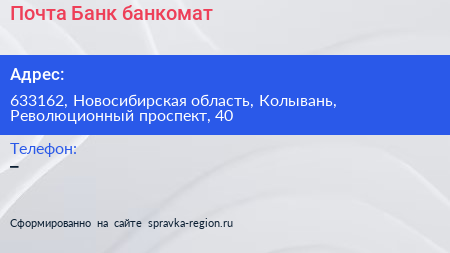 Почта Банк, банкомат по адресу 633162, Новосибирская область, Колывань, Революционный проспект, 40 в дальнейшем Организация, размещена в следующих категориях: