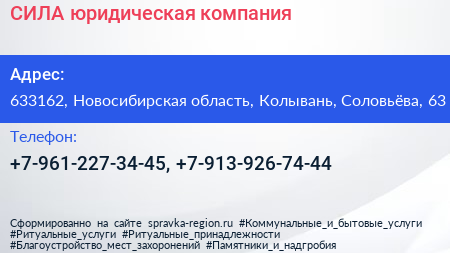 СИЛА, юридическая компания по адресу 633162, Новосибирская область, Колывань, Соловьёва, 63 в дальнейшем Организация, размещена в следующих категориях: