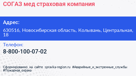 СОГАЗ-мед, страховая компания по адресу 630516, Новосибирская область, Колывань, Центральная, 18 в дальнейшем Организация, размещена в следующих категориях: