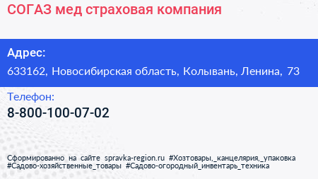 СОГАЗ-мед, страховая компания по адресу 633162, Новосибирская область, Колывань, Ленина, 73 в дальнейшем Организация, размещена в следующих категориях: