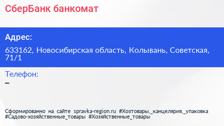 СберБанк, банкомат по адресу 633162, Новосибирская область, Колывань, Советская, 71/1 в дальнейшем Организация, размещена в следующих категориях: