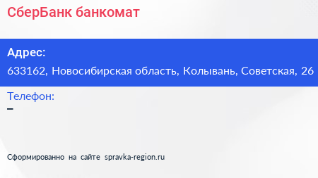 СберБанк, банкомат по адресу 633162, Новосибирская область, Колывань, Советская, 26 в дальнейшем Организация, размещена в следующих категориях: