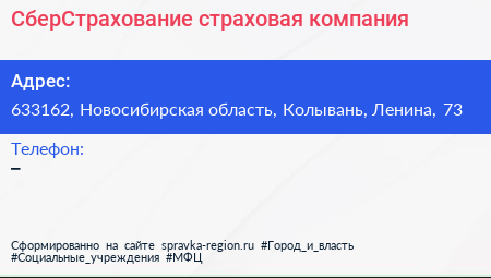 СберСтрахование, страховая компания по адресу 633162, Новосибирская область, Колывань, Ленина, 73 в дальнейшем Организация, размещена в следующих категориях: